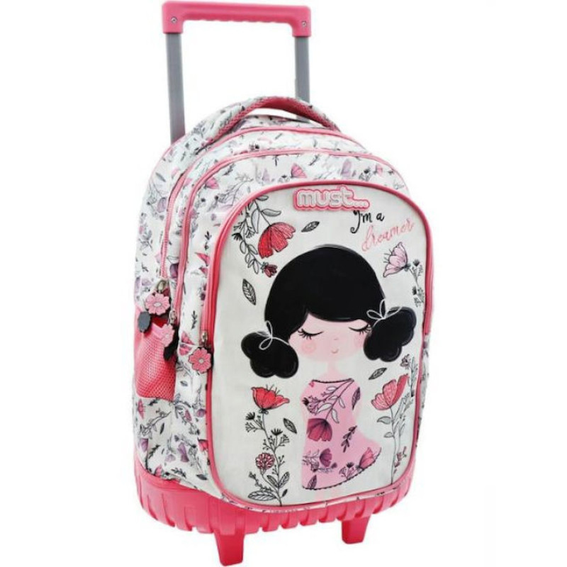 Σχολική Τσάντα Τρόλεϊ Δημοτικού Must I am A Dreamer με 3 θήκες σε εντυπωσιακό κεντημένο σχέδιο κορίτσι με λουλουδάκια.